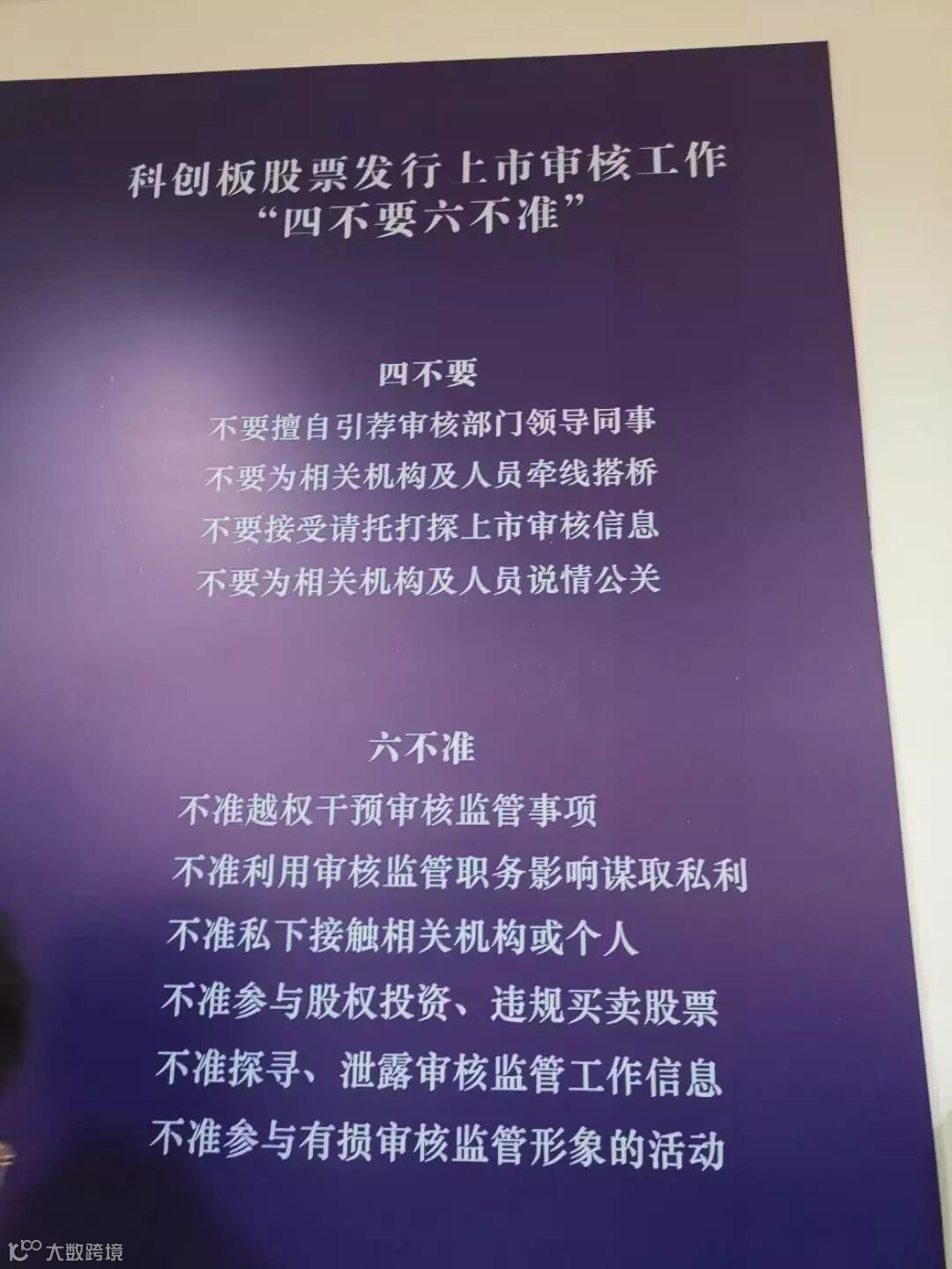 上市审核中心还在大门边的墙壁醒目位置,以蓝底白字的形式张贴了审核中心的职责、上市审核流程,以及审核工作中的“四不要六不准”。