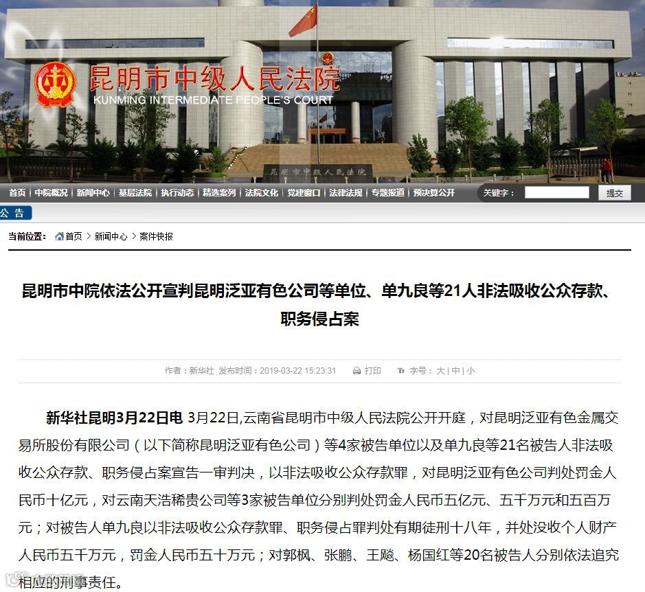 3月22日,云南省昆明市中级人民法院公开开庭,对昆明泛亚有色金属交易所股份有限公司(以下简称昆明泛亚有色公司)等4家被告单位以及单九良等21名被告人非法吸收公众存款、职务侵占案宣告一审判决: