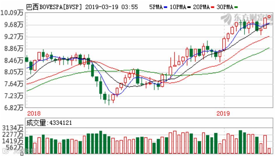 3月19日,巴西圣保罗证交所指数Ibovespa盘中首次升破100000点,最终当日收涨0.86%,报99993.92点。截至周一收盘,今年以来巴西股指累计上涨14%。