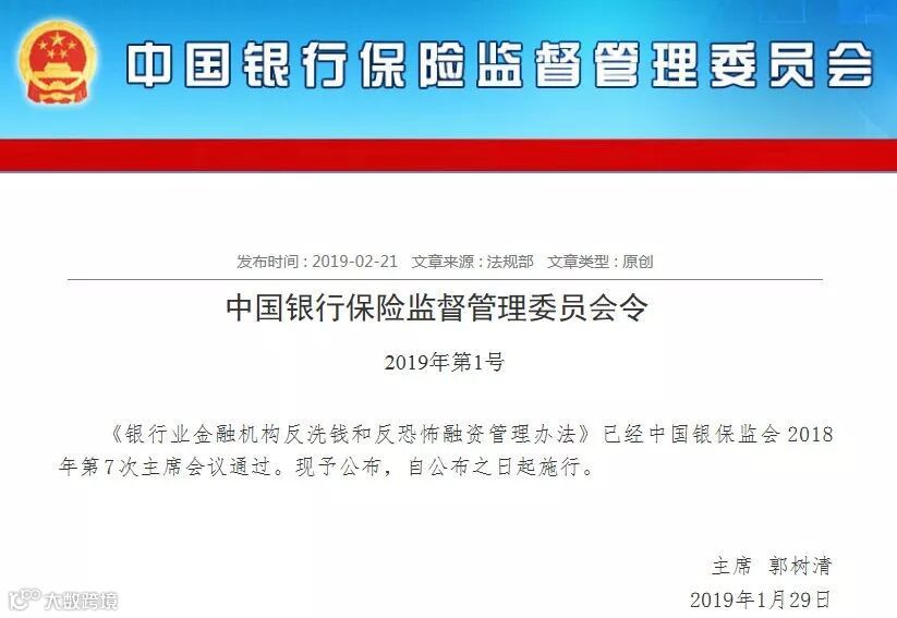 《银行业金融机构反洗钱和反恐怖融资管理办法》(简称《办法》)今日(2月21日)晚间发布,这份由银保监会主席郭树清签署的文件,要求银行业金融机构应当将反洗钱和反恐怖融资要求嵌入到合规管理、内部控制制度,确保洗钱和恐怖融资风险管理体系能够全面覆盖各项产品及服务。