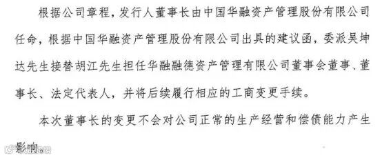3月12日晚间,华融融德资产管理有限公司(以下简称“华融融德”)董事长发生变更,吴坤达接替胡江担任华融融德董事、董事长、法定代表人,并将变更工商信息。