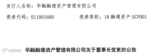 3月12日晚间,银行间市场发布公告,“18融德资产SCP001“超短期债券发布公告称,中国华融委派吴坤达接替胡江担任华融融德董事、董事长、法定代表人,并将变更工商信息。