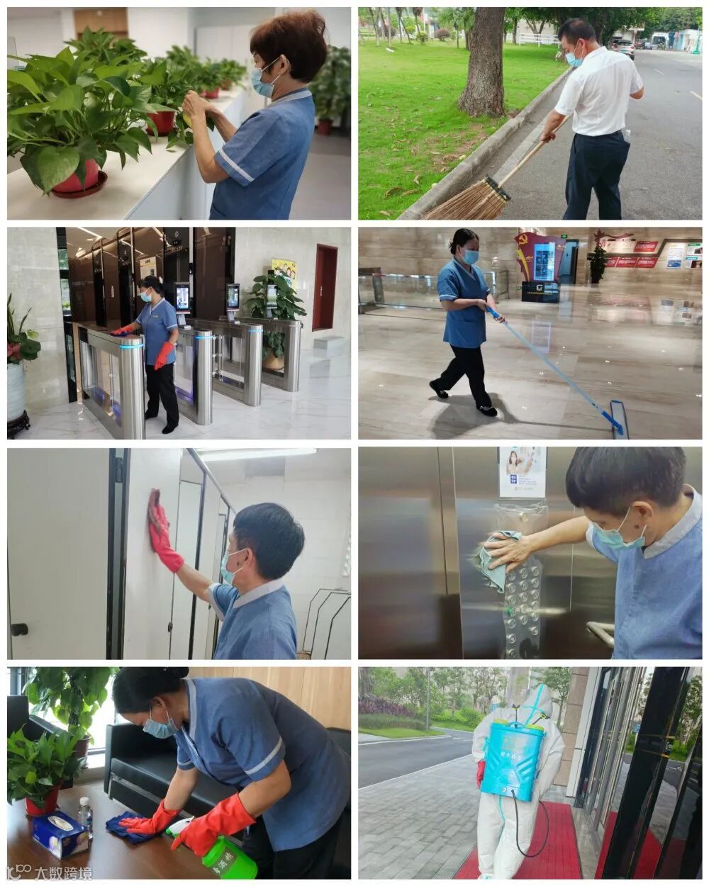 19日下午,赶回园区的清洁、客服齐心协力,对CI、C2栋办公大楼及招商中心的绿植黄叶进行清理修剪、淋水养护。擦拭灰尘、洒扫落叶、清理垃圾、清除杂草,不放过任何一个细节;厕所、电梯、办公室、闸机、前台、大堂、楼层、展厅、外围道路,全方位喷洒消杀,不遗漏每一个角落。经过一整个下午的清洁消杀,园区内花香四溢、生机勃勃,疫情当下的“阴霾”被逐渐褪去。