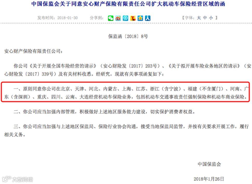 一个重要背景是互联网保险公司的车险经营区域需要审批。对于互联网保险公司而言,车险经营范围是各家“一事一议”,都需要监管单独批准和逐渐扩大地区范围。
