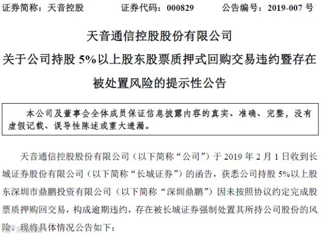 日前,天音控股公告称,公司持股5%以上股东深圳市鼎鹏投资有限公司因未按照协议约定完成股票质押购回交易,构成逾期违约,存在被长城证券强制处置其所持公司股份的风险。