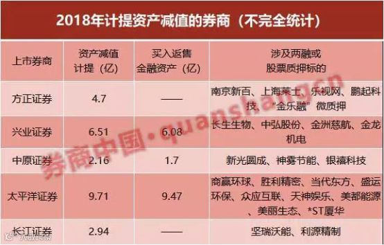这段时间,多家上市券商因为股权质押业务大幅计提减值,这个业务的风险正在逐渐显现,包括方正证券、兴业证券、中原证券、太平洋证券和长江证券等,平均每家减值准备约5亿,累计超过26亿元。