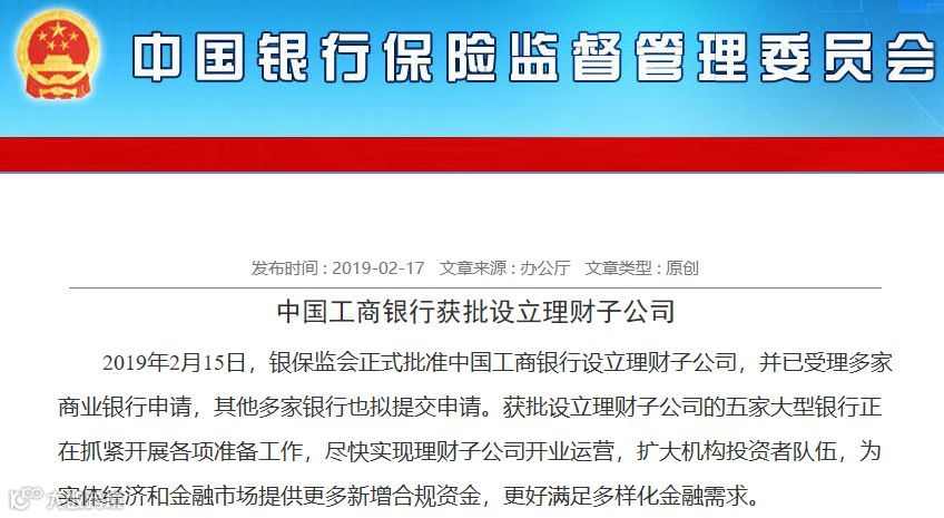 2月17日,银保监会发布公告称,正式批准中国工商银行设立理财子公司,并已受理多家商业银行申请,其他多家银行也拟提交申请。获批设立理财子公司的五家大型银行正在抓紧开展各项准备工作,尽快实现理财子公司开业运营,扩大机构投资者队伍,为实体经济和金融市场提供更多新增合规资金,更好满足多样化金融需求。
