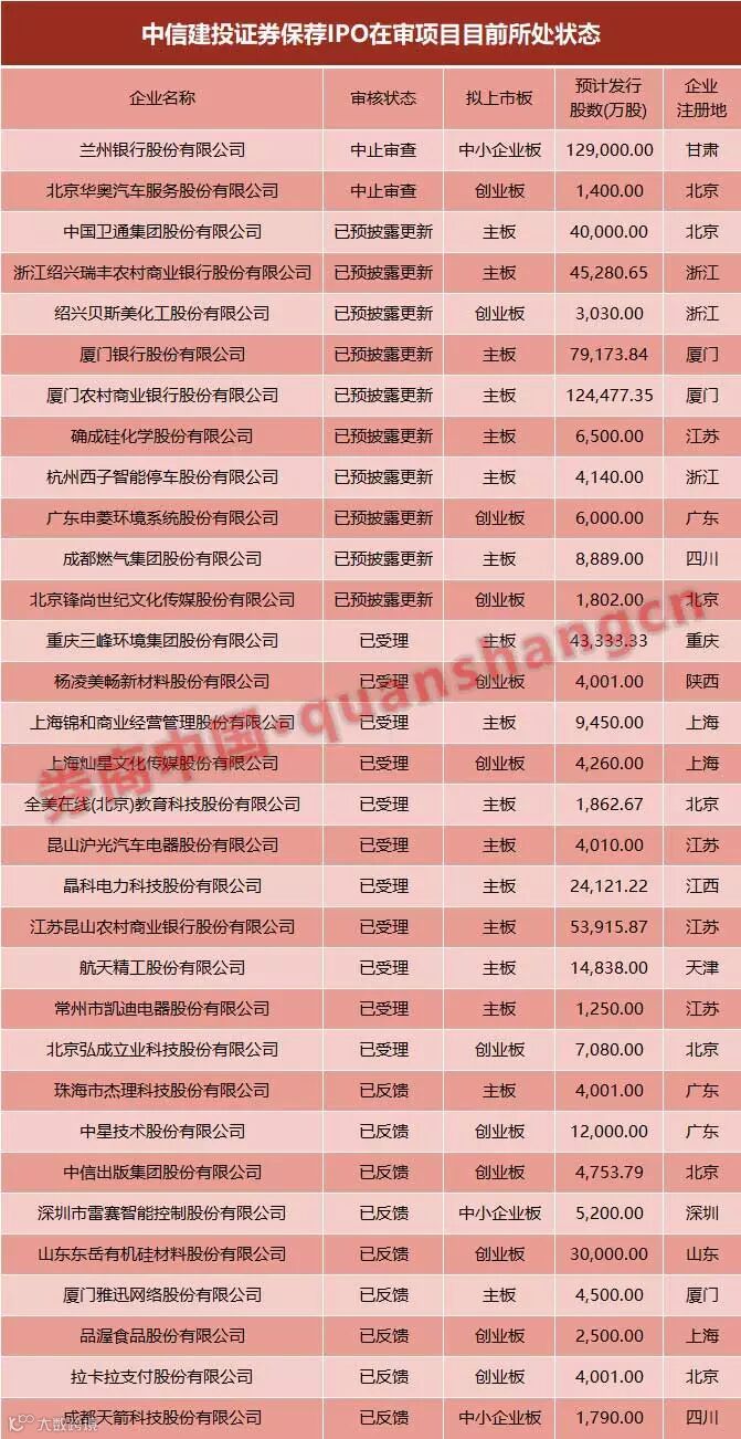 值得一提的是,中信建投证券在审项目中,至少有四家为商业银行,其中包括厦门银行、厦门农商行、兰州银行、江苏昆山农商行。