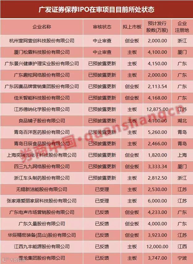 广发证券的20个在审IPO项目中,良品铺子、佳禾智能科技等11个项目已预披露更新,江西九丰能源等5个项目已反馈,张家港爱丽加剧科技股份有限公司等2个项目已受理,杭州壹网壹创科技股份有限公司、厦门松霖科技股份有限公司两个项目中止审查。