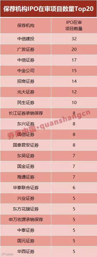 券商中国记者根据wind统计,截至1月25日,在审IPO项目数为267家(统计审核状态包括已受理、已反馈、已预披露更新、中止审查、暂缓表决),其中在审IPO项目最多的保荐机构为中信建投证券,共有32个项目正被审;第二名为广发证券,有20个项目处于在审阶段;中信证券有17个IPO项目正处于审查阶段,排名第三。