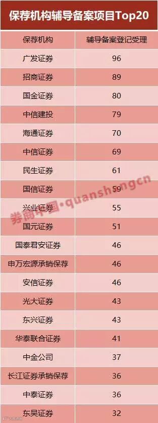 有10家保荐机构分别拥有超过50个处于辅导期的IPO项目,分别为广发证券、招商证券、国金证券、中信建投、海通证券、中信证券、民生证券、国信证券、兴业证券以及国元证券。其中广发证券有96个处于辅导期的项目,招商证券有89个,国金证券有80个辅导期项目。