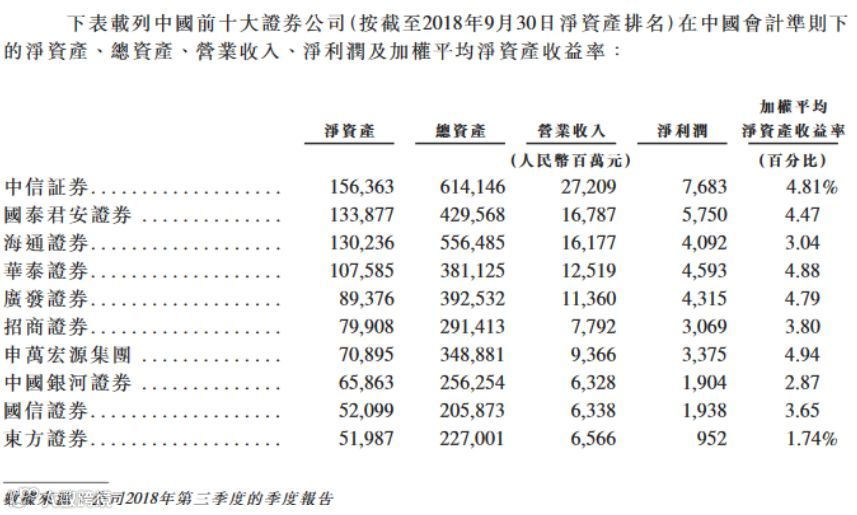 按照净资产计,截至2018年9月30日,申万宏源在中国前十大券商中排名第七,净资产共708.95亿元。排在前六位的是中信证券、国泰君安证券、海通证券、华泰证券、广发证券和招商证券。