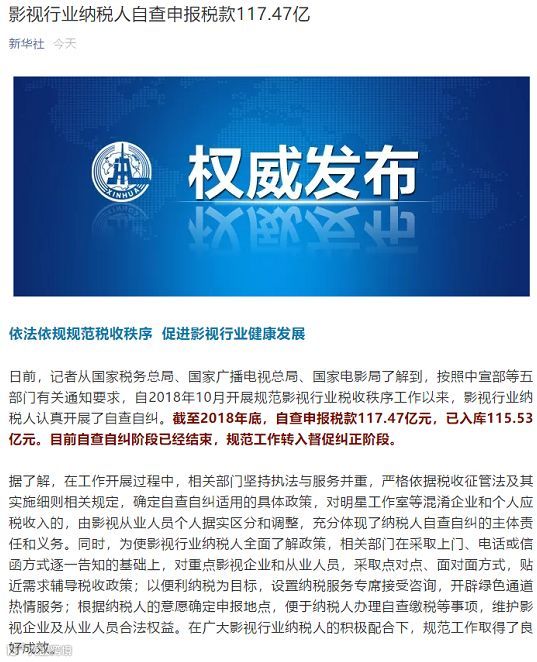据新华社报道,从国家税务总局、国家广播电视总局、国家电影局了解到,按照中宣部等五部门有关通知要求,自2018年10月开展规范影视行业税收秩序工作以来,影视行业纳税人认真开展了自查自纠。截至2018年底,自查申报税款117.47亿元,已入库115.53亿元。目前自查自纠阶段已经结束,规范工作转入督促纠正阶段。