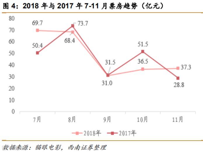 猫眼电影数据显示,2018年11月的总票房为37.3亿元,同比超过2017年11月的28.8亿元,也是自8月以来第一次月度票房超过2017年,环比超过拥有国庆档的10月。其中《毒液:致命守护者》成为2018年11月的票房冠军,贡献了17.5亿元的票房,综合票房占月票房的比例超过45%。