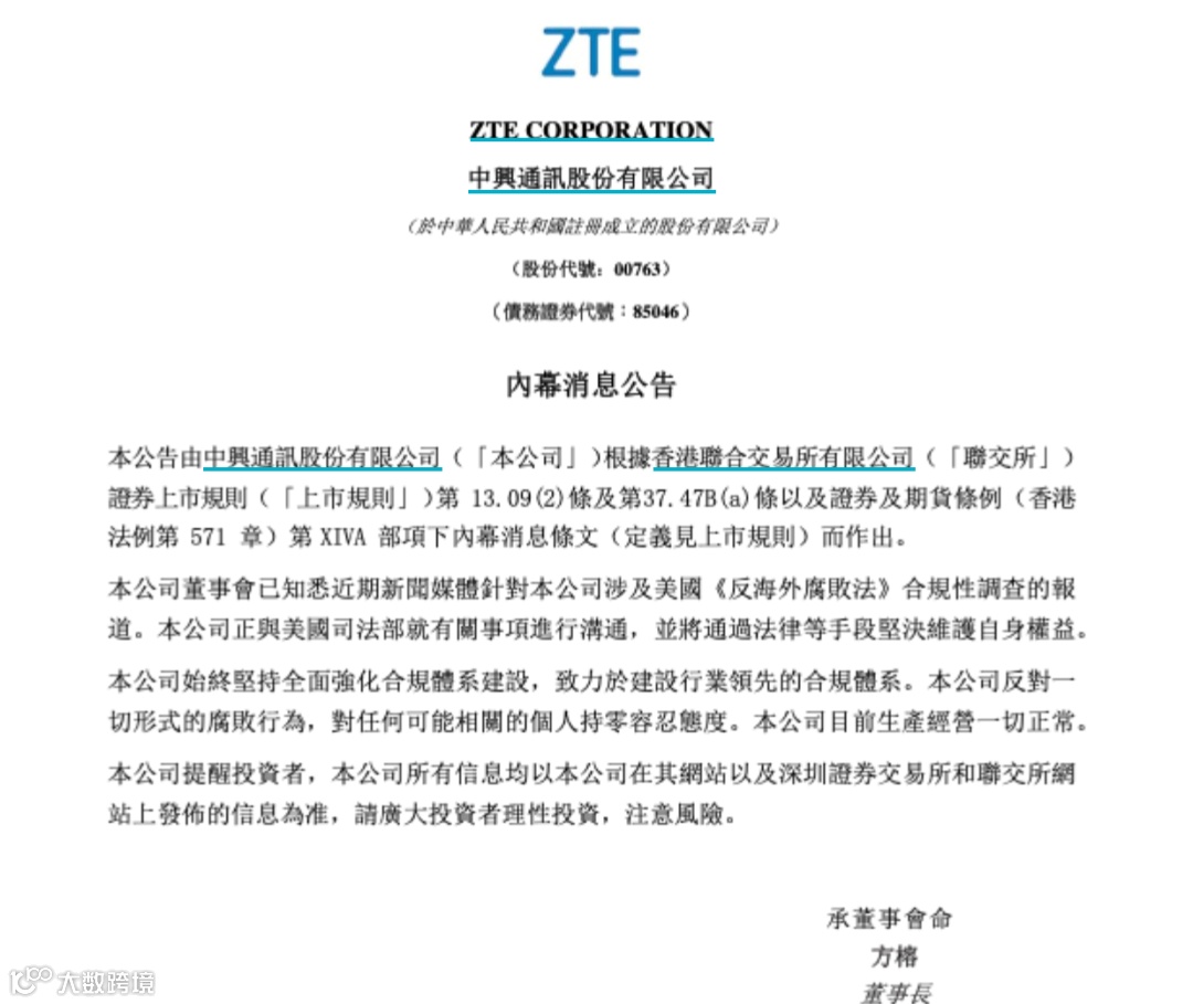 12月11日,中兴通讯在港交所公告称,公司董事会已知悉近期新闻媒体针对公司涉及美国《反海外腐败法》合规性调查的报道。公司正与美国司法部就有关事项进行沟通,并将通过法律等手段坚决维护自身权益。