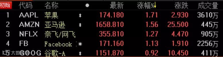 具体来看,科技股继续成为行情反弹的主力军。美国五大科技股FAANG全线收高,苹果收涨1.71%,亚马逊收涨1.56%,奈飞收涨1.27%,Facebook收涨1.13%,谷歌收涨0.92%。