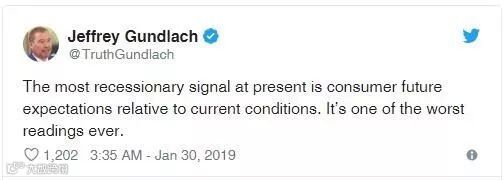 Gundlach表示,当前消费者信心与预期之差达到2001年3月以来最大,那时正是美国经济衰退的第一个月。