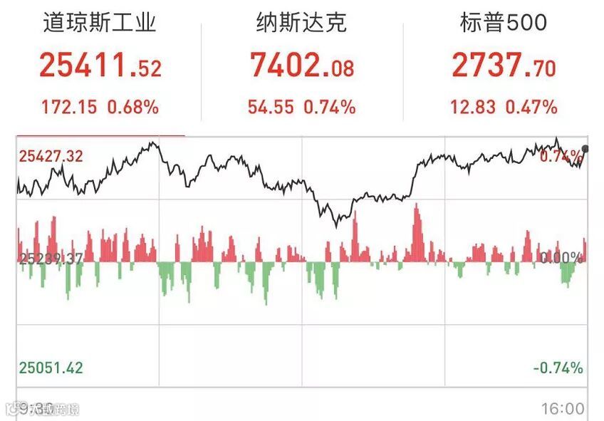 道指收涨172.15点,涨幅0.68%,报25411.52点。标普500指数收涨12.83点,涨幅0.47%,报2737.70点,实现五连涨。纳指收涨54.55点,涨幅0.74%,报7402.08点。