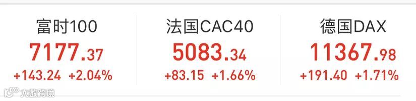 英国富时100指数收涨2.04%,报7177.37点,创2018年10月9日以来收盘新高。法国CAC 40指数收涨1.66%,报5083.34点。德国DAX 30指数收涨1.71%,报11367.98点。意大利富时MIB指数收涨1.16%,报19833.49点。