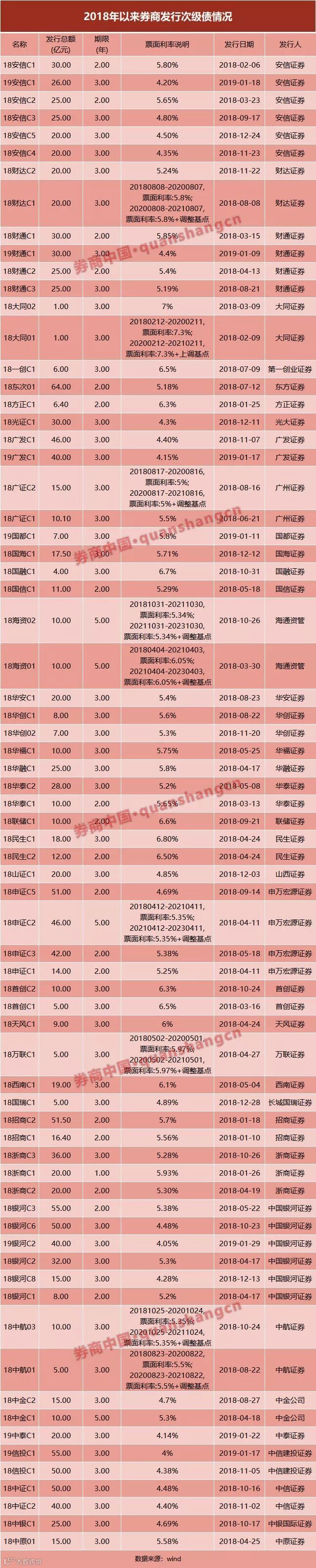 银河证券和安信证券均分别发行了6期次级债,银河证券共以次级债形式募资200亿元,安信证券共募资146亿元。申万宏源发行了4期次级债,共募资153亿元。