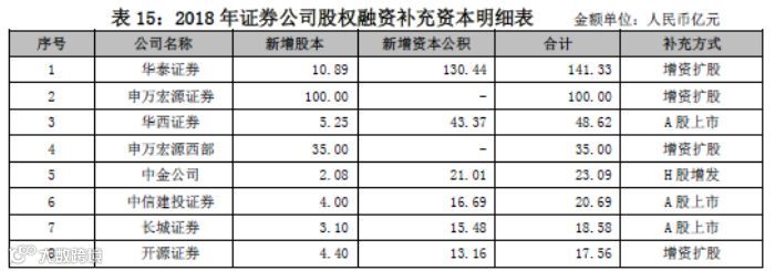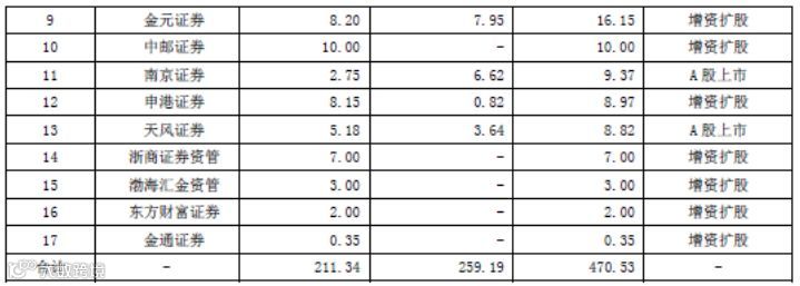 其中华泰证券募资141.33亿元,申万宏源证券100亿,申万宏源西部35亿,中金公司H股增发23.09亿元,开源证券增资扩股17.56亿元,金元证券增资扩股16.15亿元,中邮证券增资扩股10亿,申港证券8.97亿元,浙商资管7亿,渤海汇金3亿,东方财富证券2亿,金通证券0.35亿元。