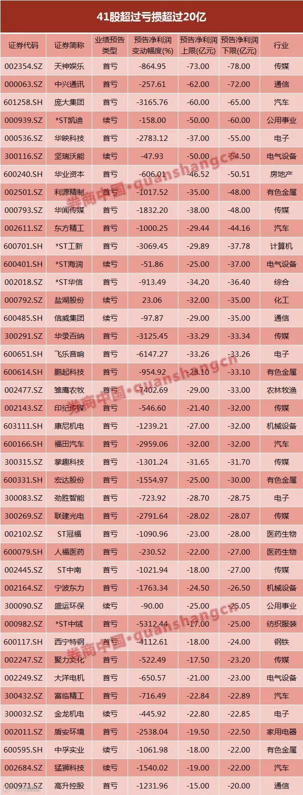 此外,*ST凯迪、华映科技、坚瑞沃能、华业资本等4股预计亏损超过50亿元。