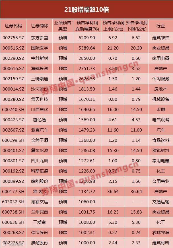 预增前三名分别是东方新星、国际医学和中科新材,分属于建筑装饰、商业贸易和家电行业。