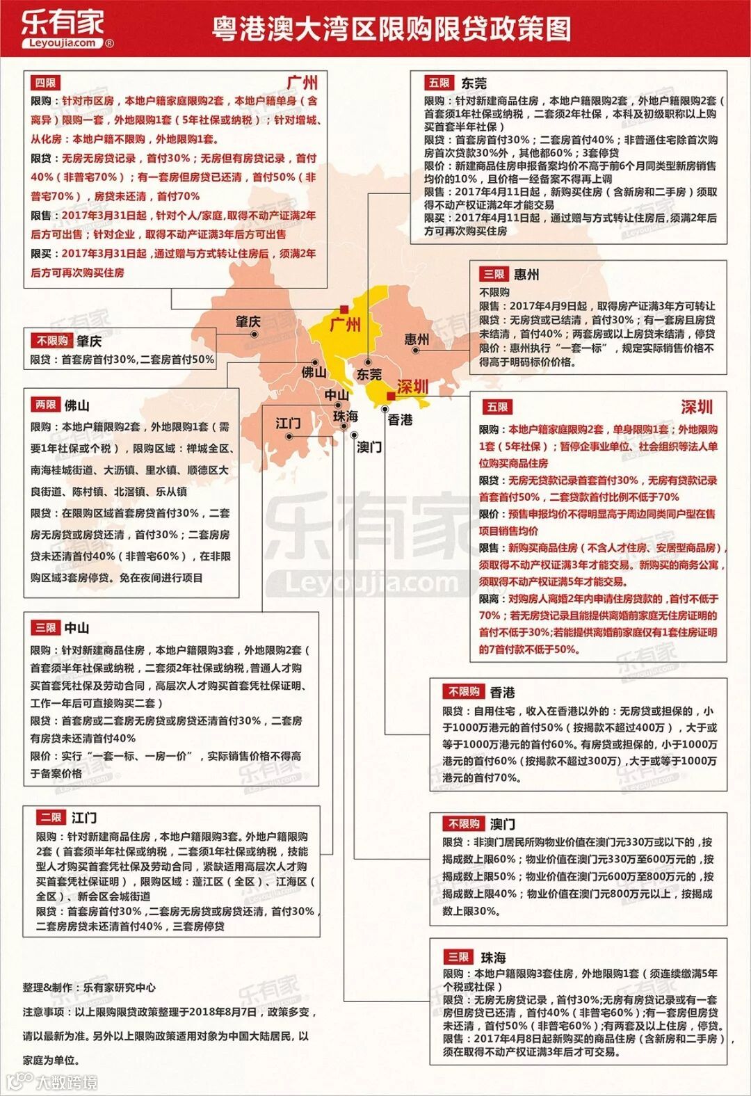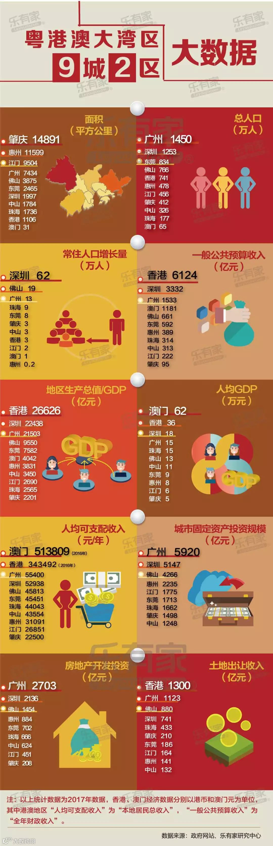 粤港澳大湾区包括香港特别行政区、澳门特别行政区和广东省广州市、深圳市、珠海市、佛山市、惠州市、东莞市、中山市、江门市、肇庆市(以下称珠三角九市),总面积5.6万平方公里,2017年末总人口约7000万人,是我国开放程度最高、经济活力最强的区域之一,在国家发展大局中具有重要战略地位。2017年大湾区经济总量约10万亿元。