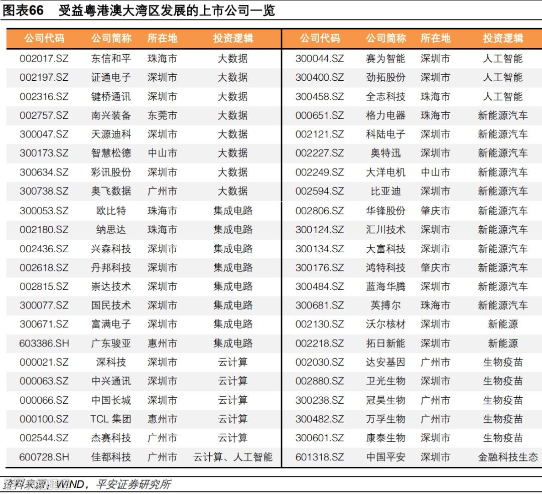 平安证券表示,从产业发展方向上看,粤港澳大湾区未来的发展将主要依靠创新与金融的融合,在全球货币政策正常化启动与国内结构性去杠杆的大背景下,近期制造业企业陆续曝光远约的案例正在增加,部分重资产高负债公司可能面临较大的投资风险。综合判断,人工智能、大数据、集成电路、云计算、新能源汽车、新能源、生物医药等新经济领域或将诞生未来的科技巨头,珠三角上述产业的发展也将显著受益未来粤港澳大湾区的融合发展。