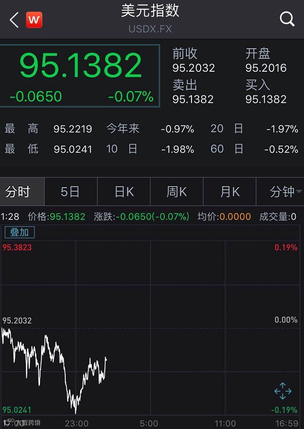 一是近几日美元指数的确在走弱,从过去在96-97附近徘徊下跌至目前的95左右。
