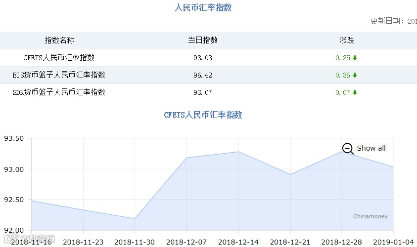 本轮人民币对美元的升值始于2018年11月中旬,截至2019年1月9日,升值幅度已超2%。不仅是人民币兑美元汇率走强,人民币兑一篮子货币总体也呈现升值态势,目前CFETS人民币汇率指数从92.40左右攀升至93.30附近。