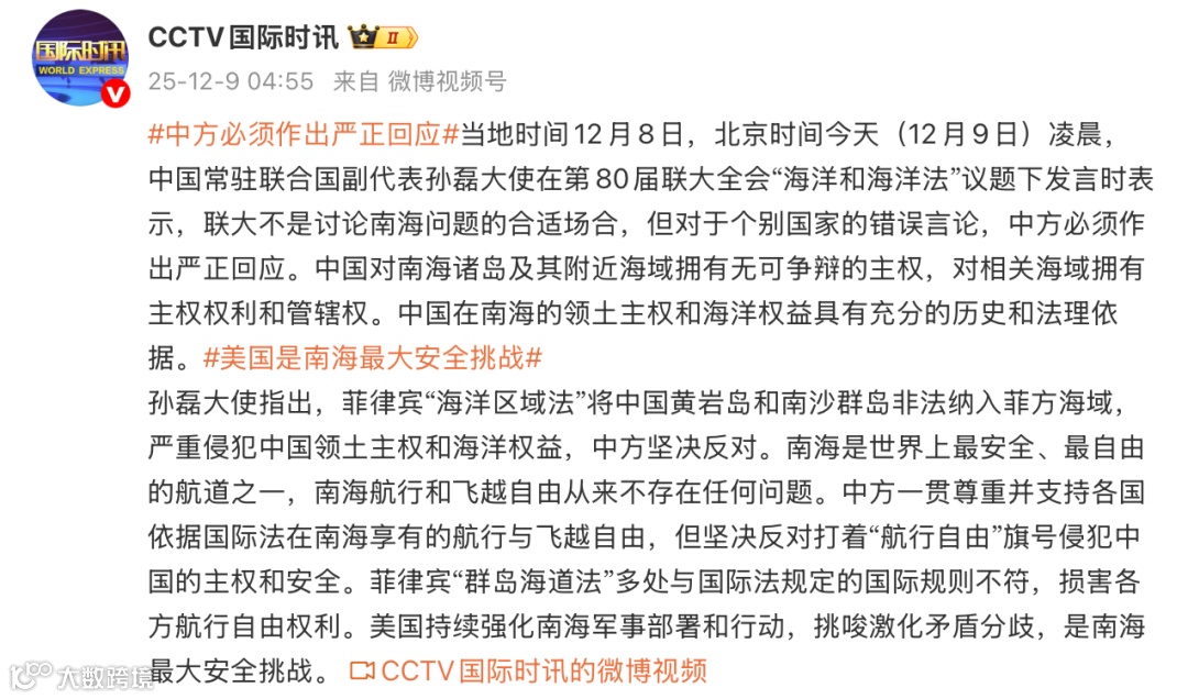 当地时间12月8日,北京时间今天(12月9日)凌晨,中国常驻联合国副代表孙磊大使在第80届联大全会“海洋和海洋法”议题下发言时表示,联大不是讨论南海问题的合适场合,但对于个别国家的错误言论,中方必须作出严正回应。中国对南海诸岛及其附近海域拥有无可争辩的主权,对相关海域拥有主权权利和管辖权。中国在南海的领土主权和海洋权益具有充分的历史和法理依据。