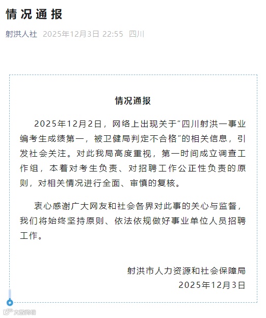 通报称,12月2日,网络上出现关于“四川射洪一事业编考生成绩第一,被卫健局判定不合格”的相关信息,引发社会关注。