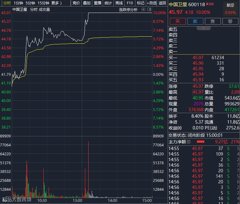 12月4日,商业航天概念股集体异动。截至今日收盘,中国卫星、海昌新材、龙洲股份、华伍股份等10多只个股涨停或涨超10%。