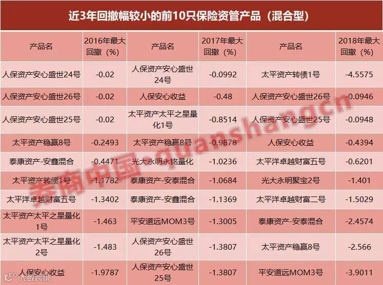 在回撤指标上,近3年回撤幅度较小的前10只保险资管产品,年度最大回撤都控制在了5%以内。其中,人保安心收益、太平资产稳赢8号连续3年表现稳定,最大回撤控制在2%以内。