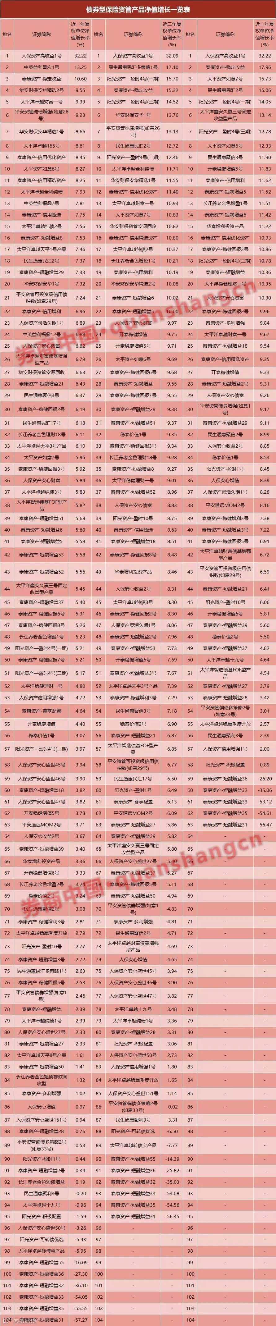 再按2016-2018年三年复权单位净值增长情况,三年净值增长率排名前十的产品分别是:人保资产高收益1号(32.22%)、泰康资产-稳定收益(17.96%)、太平资产如意7号(15.73%)、民生通惠民汇2号(15.06%)、阳光资产—盈时4号(一期)(14.05%)、太平洋鑫安久赢三号固定收益型产品(13.14%)、阳光资产—盈时4号(三期)(12.78%)、太平资产如意6号(12.33%)、民生通惠聚信3号(11.90%)、开泰稳健增值5号(11.83%)。