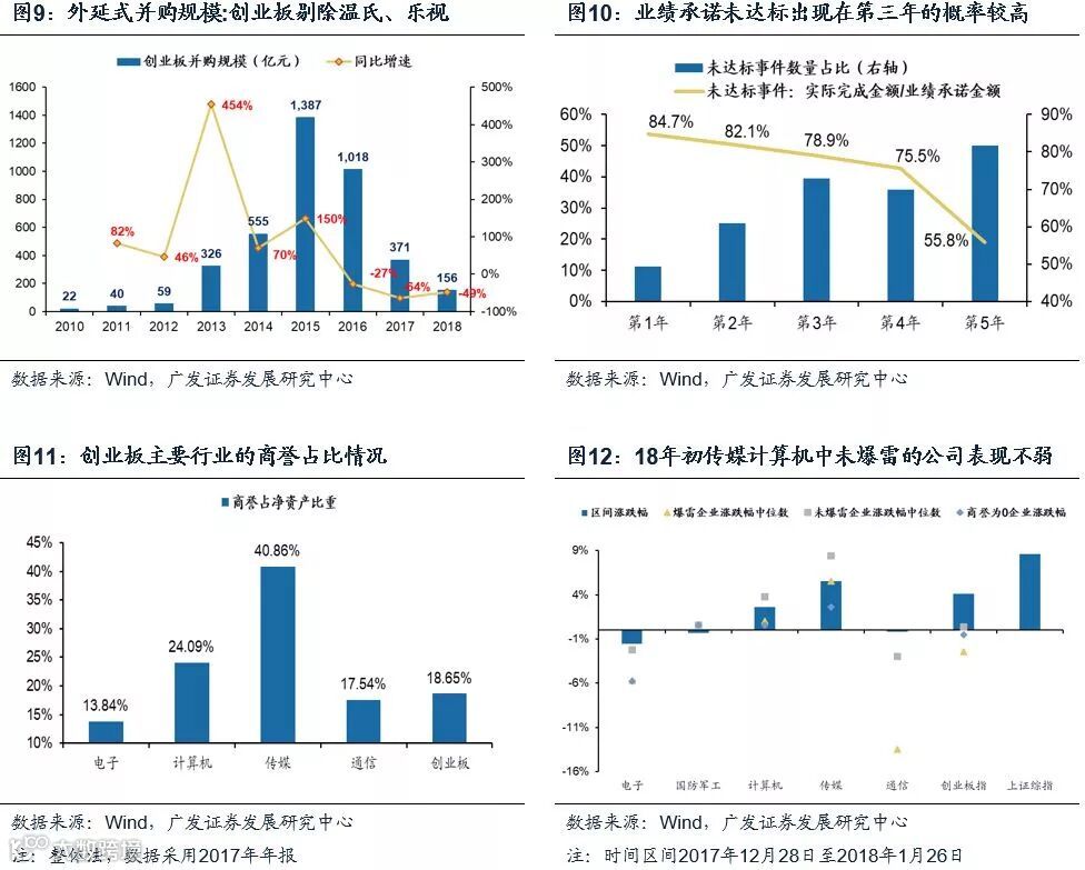 投资者担忧可能会出现2018年1月春季躁动时,创业板由于多起商誉减值“爆雷”而导致明显跑输的行情分化。但2018年的春季躁动主要由出口超预期、全球经济增长数据表现强劲等因素触发对于中国经济上行A股盈利向好的预期,即由DDM模型分子端改善驱动的躁动行情。因此不同板块之间的业绩差异产生了分化行情,业绩向好且确定性高的板块(当时顺周期的周期和消费)领涨,业绩较差的板块涨幅明显落后。尽管如此,从2018年年初商誉占比高的行业,如传媒、计算机等的内部表现来看,表现的排序为有商誉未爆雷>行业整体>无商誉公司>商誉减值公司,剔除业绩“爆雷”公司,其他公司的表现并不弱,因此需要回避的是个股而非整个板块。但无商誉的公司未必跑赢有商誉的公司,说明市场对于优质的并购还是买账。商誉对于公司业绩是正向推进还是负向拖累,其本质上取决于当初所并购资产的质量和估值。