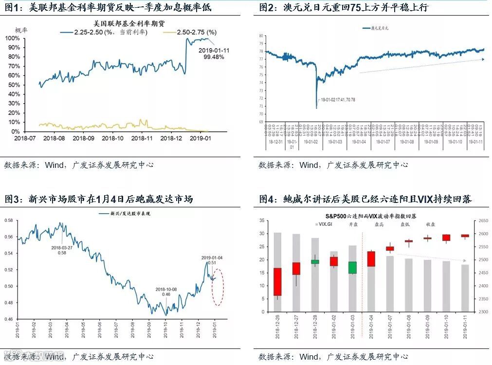 从近期资产表现来看,1)外汇:美元指数回落、人民币升值、澳元(大宗商品原料需求)兑日元(避险)平稳向上;2)利率:美联邦基金利率期货反映一季度加息概率低;3)股市:美股六连阳而VIX波动率指数连续回落、新兴市场股市跑赢发达市场;4)A股:成交量上行,主题投资表现活跃;5)事件:中美双方首次贸易磋商结束,无负面消息传出,当前各类资产价格的交叉表现印证了我们此前的判断,全球投资者对于风险资产risk-on。