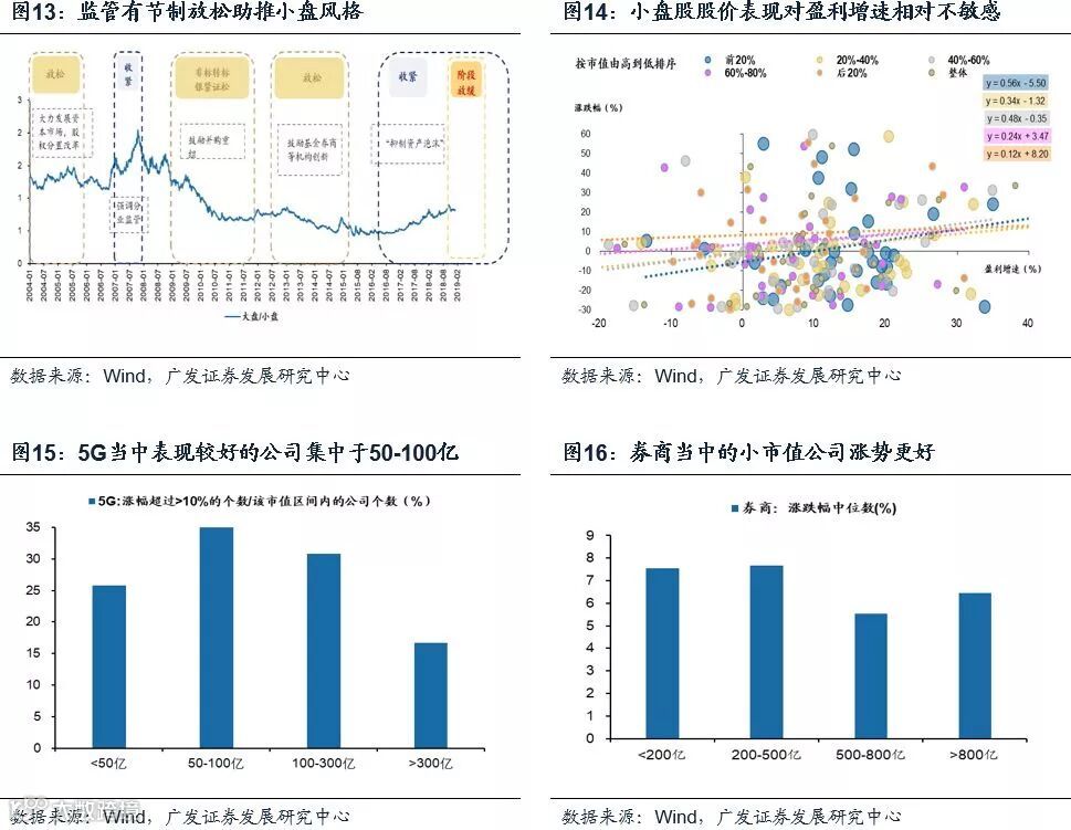 我们建议参与“春季躁动”的投资者要迅速适应本轮阶段性行情与过去三年价值风格不同的选股策略。原因有以下四点:1)当前处于企业盈利增速下行的周期当中;2)我们在2018年12月3日发布的报告《冰与火之歌——2019年A股年度策略展望》中曾提到,监管相对宽松的环境对A股的风险偏好有所助推,通常小盘风格表现占优;3)而从2000年以来的涨跌幅和盈利增速实证表现中,发现市值越小的公司,涨跌幅与盈利增速的相关度越低,即盈利下行周期中,小市值公司的股价表现对于盈利增速下行不敏感;4)近期A股成交量有所修复,主题概念表现活跃度提升。以上四点均指向自2016年以来的大蓝筹价值风格已然发生阶段性变化,逆周期行业+小市值+带题材概念的品种在当前阶段最为受益。近期券商和5G内部小市值高弹性的公司涨幅更好便是反映。建议继续关注带有主题概念的逆周期:盈利逆周期成长股(军工、游戏、云计算)+政策逆周期传统与新兴基建(5G、特高压、核电、轨交)。