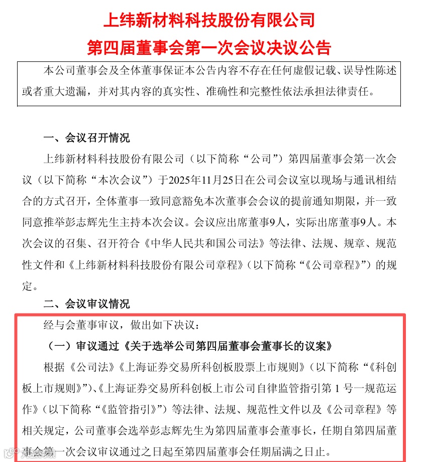 在随后举行的第四届董事会第一次会议上,彭志辉被一致推选为公司董事长,并担任战略与可持续发展委员会主任委员。这一重大人事变动背后,是公司控制权的变更。此前,上海智元恒岳科技合伙企业已成为上纬新材新任控股股东,邓泰华成为实际控制人。
