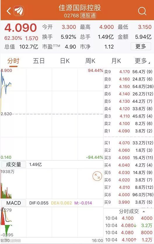 今日早盘,经过昨日暴跌洗礼的佳源国际控股大幅高开,开盘2分钟,股价飙升至4.9港元,大涨94.44%,随后股价有所回落,截至券商中国发稿,股价稳定在4港元左右,涨幅约60%。