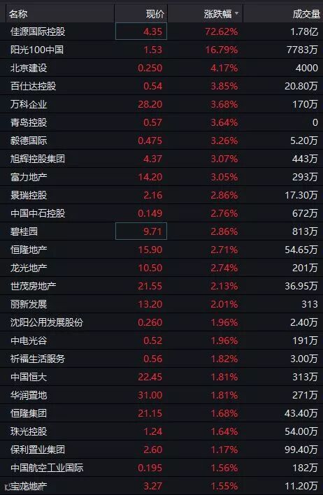 个股方面,昨日同样暴跌的阳光100中国大涨近17%,万科企业、富力地产上涨逾3%,碧桂园、龙光地产、恒隆地产等涨逾2%,中国恒大、华润置地、保利置业集团等上涨逾1%。
