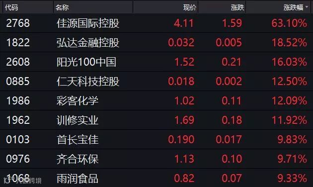 有意思的是,昨日暴跌的4只港股——佳源国际控股、弘达金融控股、阳光100中国、仁天科技控股,今日占据了港股主板市场涨幅前4名。