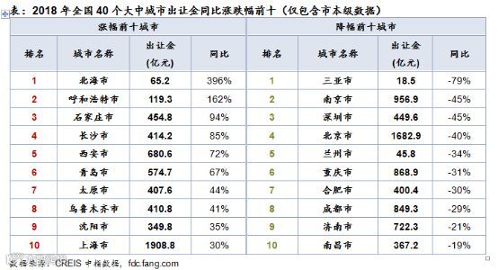 券商中国记者梳理国家统计局70大中城市房价数据来看,全国40大中城市出让金同比涨幅居前的城市也是2018年房价涨幅居前的城市。