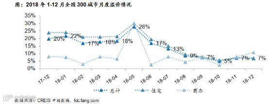 全国300个城市土地平均溢价率13%,同比下降16个百分点。其中住宅类用地平均溢价率15%,同比下降19个百分点。自2018年5月达到高点28%后,全国300城土地平均溢价率持续走低,至12月更是降至7%,降幅高达21个百分点。