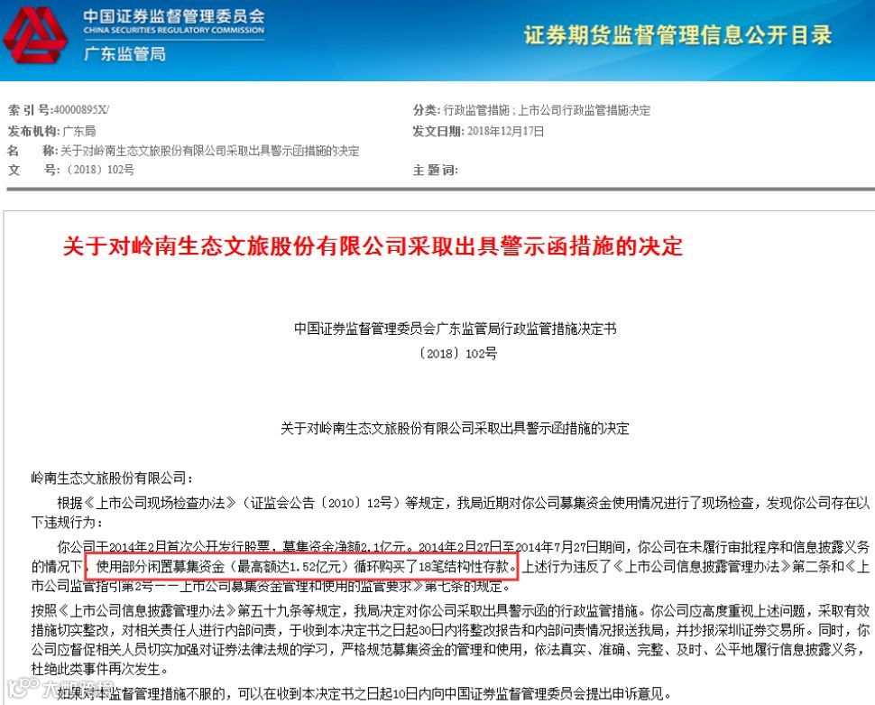 12月18日,岭南股份因在未履行审批程序和信息披露义务情况下,使用部分闲置募集资金购买结构性存款的行为违规,募集资金净额2.1亿元,2014年2月27日至2014年7月27日期间,使用部分闲置募集资金(最高额达1.52亿元)循环购买了18笔结构性存款,因此,公司及董事长、财务总监、董事会秘书一同被广东证监局采取出具警示函的行政监管措施。