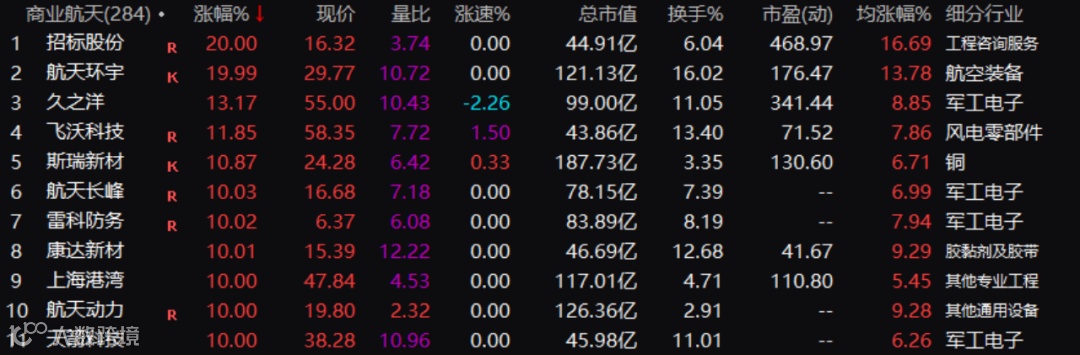 11月24日早盘,商业航天板块迎来大爆发,整个板块涨停或涨幅超过10%的个股一度达到11只。招标股份开盘2分钟涨停,航天环宇亦是20%涨停,航天长峰、航天动力等封板。