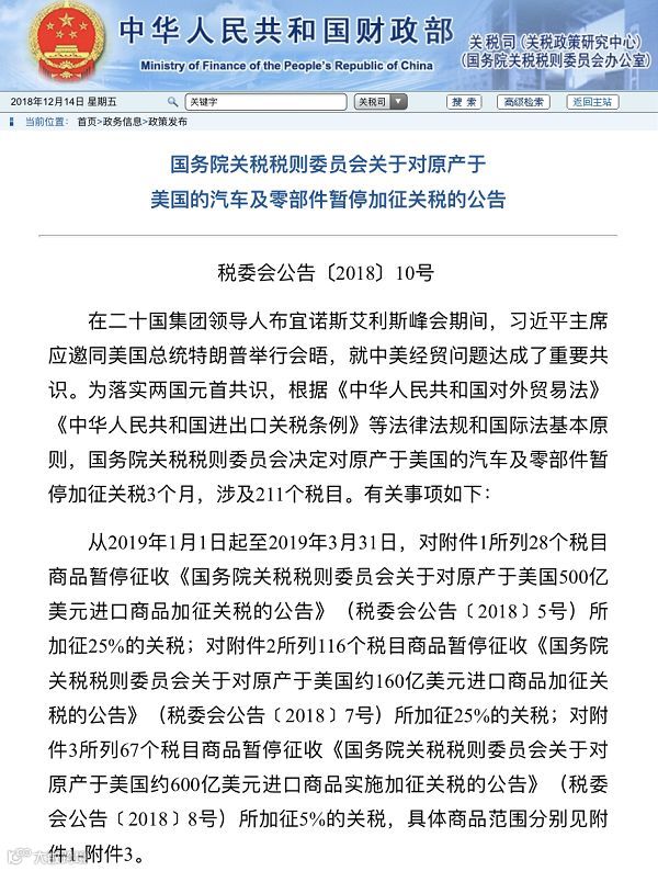 在二十国集团领导人布宜诺斯艾利斯峰会期间,习近平应邀同特朗普举行会晤,就中美经贸问题达成了重要共识。为落实两国元首共识,根据《中华人民共和国对外贸易法》《中华人民共和国进出口关税条例》等法律法规和国际法基本原则,国务院关税税则委员会决定对原产于美国的汽车及零部件暂停加征关税3个月,涉及211个税目。