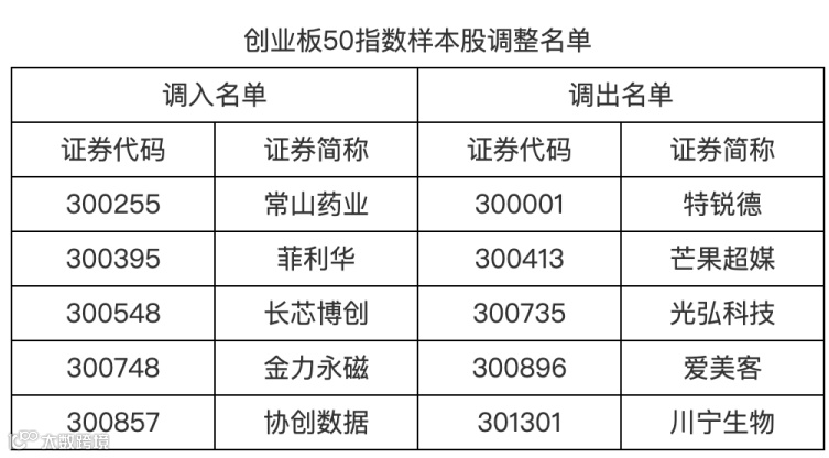 创业板50指数样本股调入常山药业、菲利华、长芯博创等5只个股,调出特锐德、芒果超媒、光弘科技等5只个股。