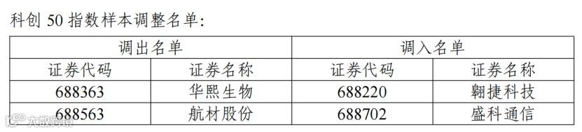 科创50指数样本股调入翱捷科技、盛科通信,调出华熙生物、航材股份。
